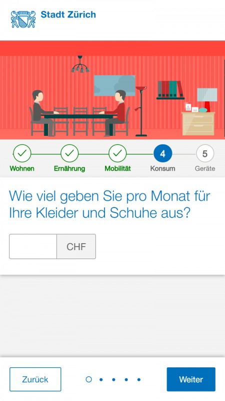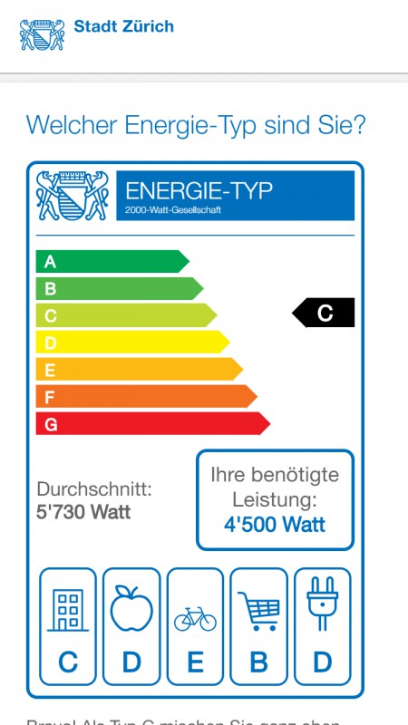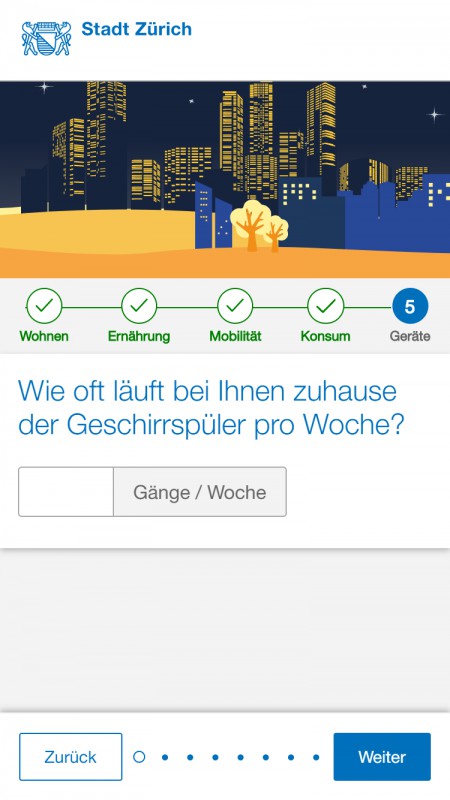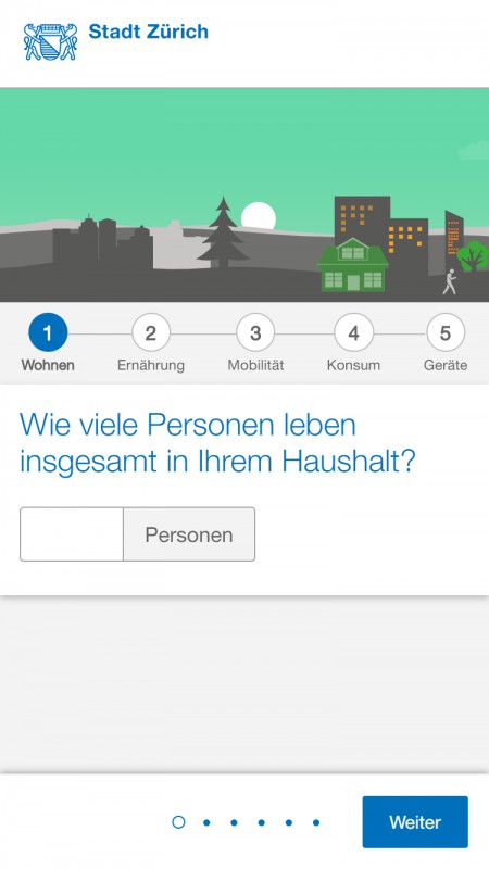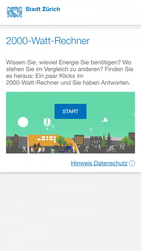 Der 2000-Watt-Rechner ist eine mobile-optimierte Web-App und erlaubt es den Bewohnern der Stadt Zürich auf einfache Art einen Überblick über ihren Energieverbrauch zu erhalten und sich des eigenen Verbrauchs besser bewusst zu werden.
