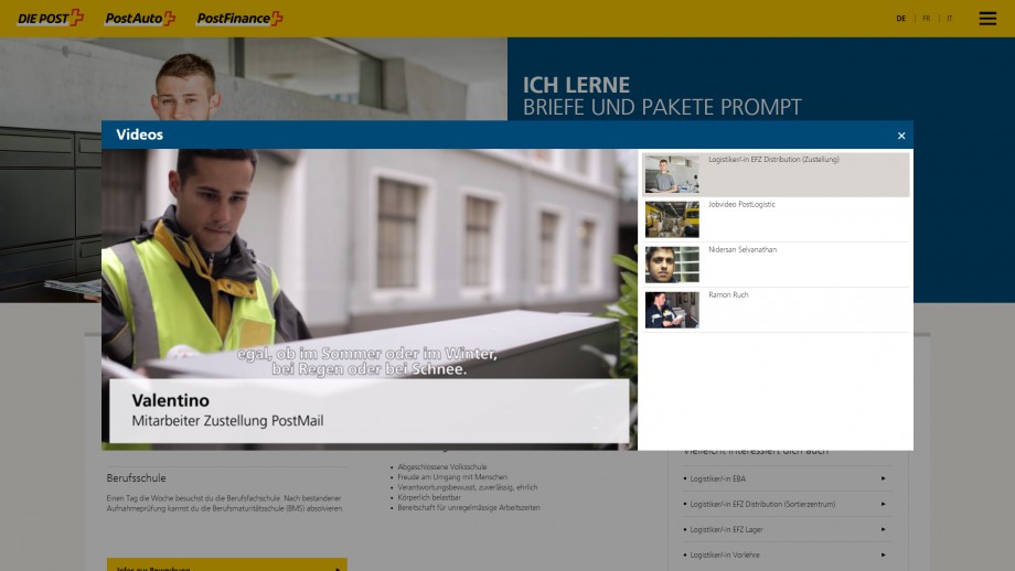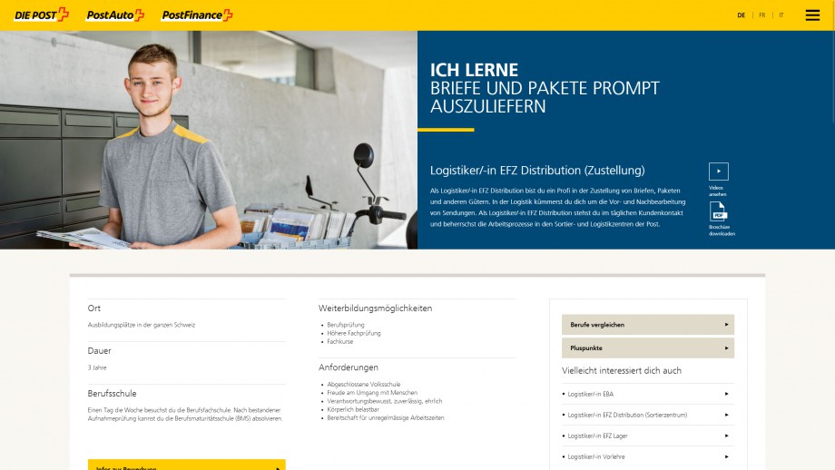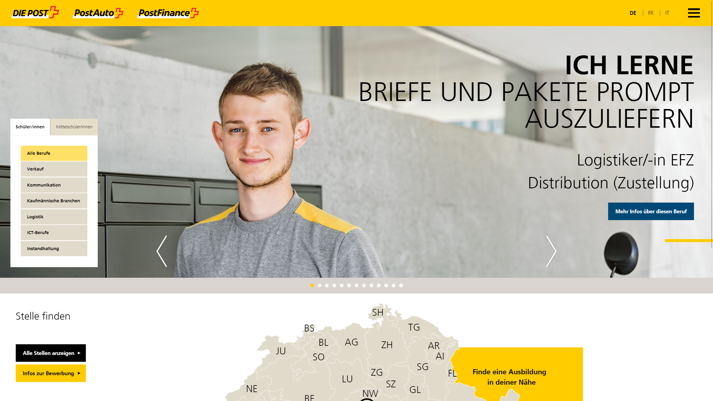 Die Schweizerische Post bietet für den Nachwuchs eine Online-Plattform an, auf welcher sich Jugendliche über die verschiedenen Lehren, welche die Post anbietet, informieren können.