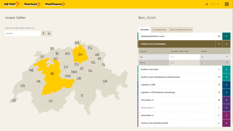 Die Lehrstellenkarte ist das Filetstück der Anwendung. Die Jugendlichen können hier einen oder mehrere ihrer bevorzugten Kantone auswählen. So sehen sie wie viele und welche Stellen noch frei sind.