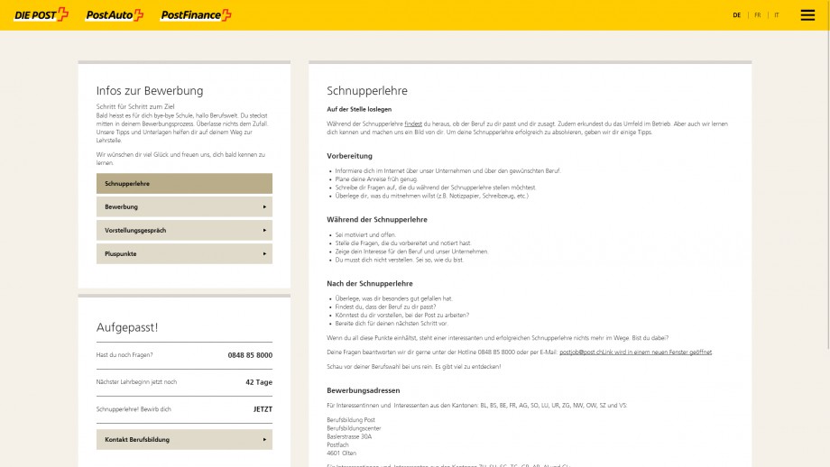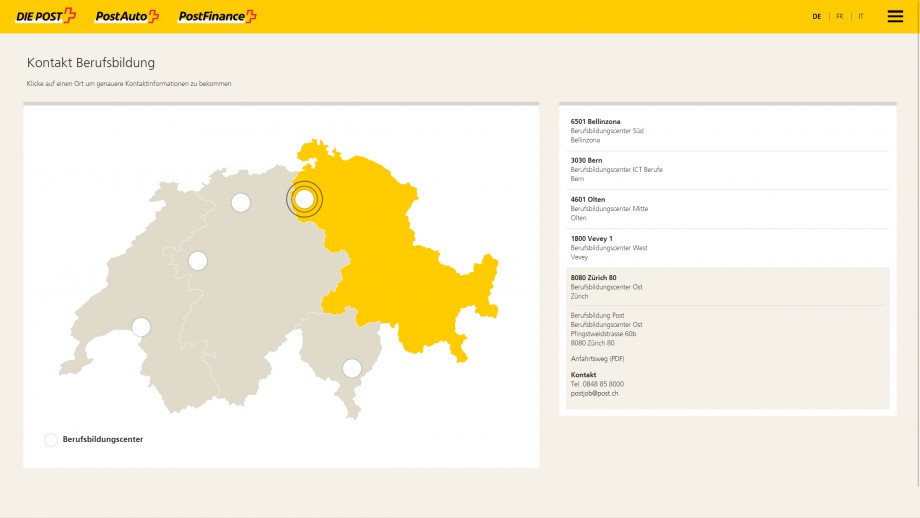 Zu allen Grundausbildungen, welche die Post anbietet, sind die wichtigsten Informationen ersichtlich. Die Jugendlichen erhalten hier Informationen über Anforderungen, freie Lehrstellen und weiteres über die Ausbildung. Sie haben auch die Möglichkeit verschiedene Lehrstellen bequem miteinander zu vergleichen.